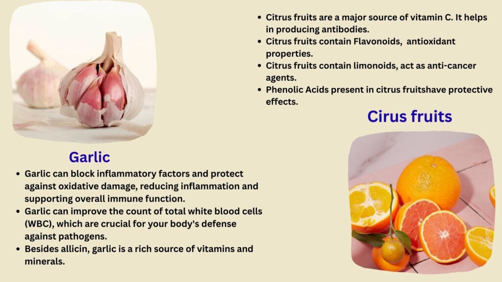 Citrus fruits support for immune cells by improving white blood cells (leukocytes), phagocytes, natural killer cells, and T-lymphocytes, all of which are crucial for a robust immune response.