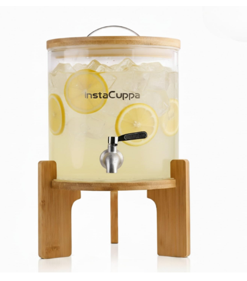 InstaCuppa Glass Beverage Dispenser | Inbuilt Thermometer | Thick Borosilicate Glass | Bamboo Stand, Steel Tap