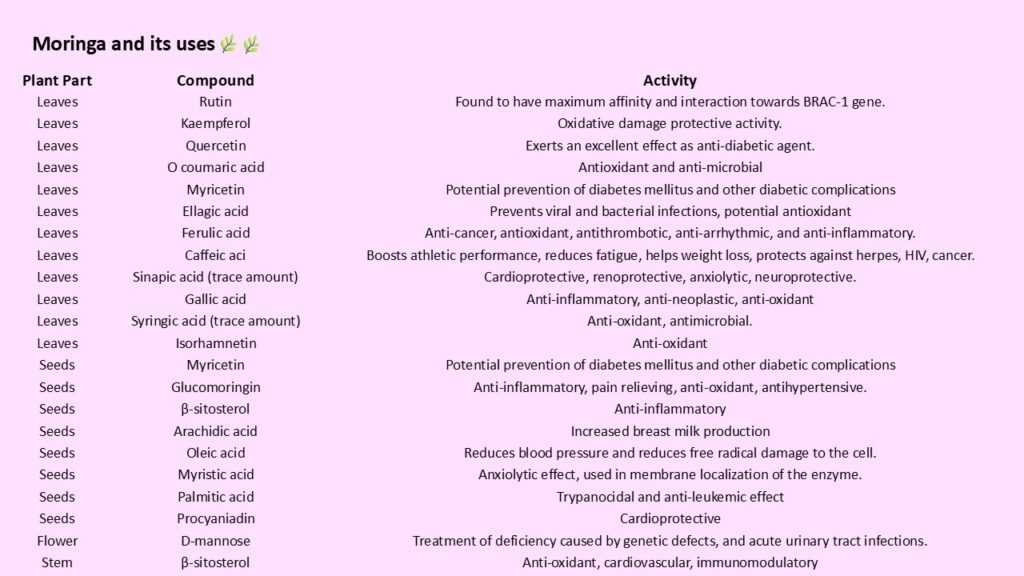 The medicinal properties of Moringa are attributed to its rich content of bioactive compounds such as alkaloids, phenolic acids, glycosides, sterols, glucosinolates, flavonoids, terpenes, and fatty acids.